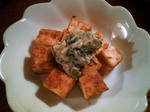 賽の目の厚揚げをいい具合にカリッと焼いて、野沢菜わさびをのせてみました!